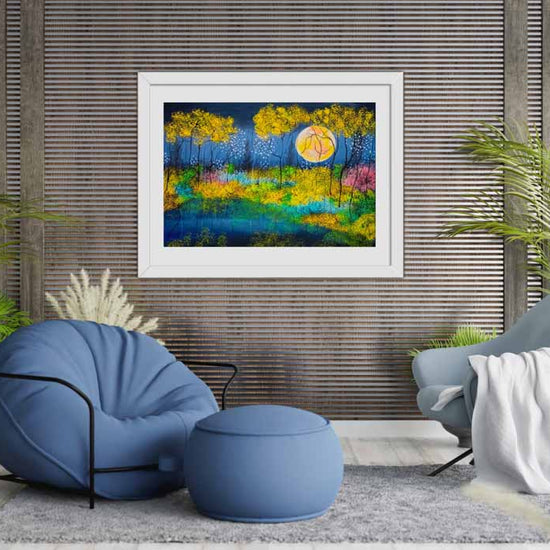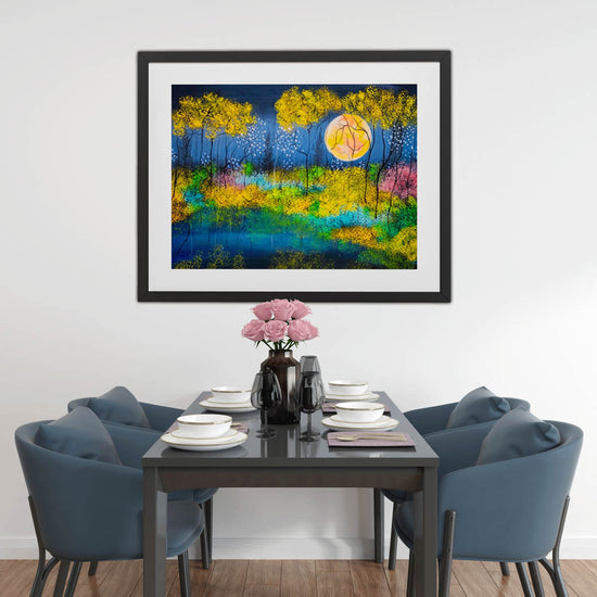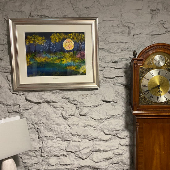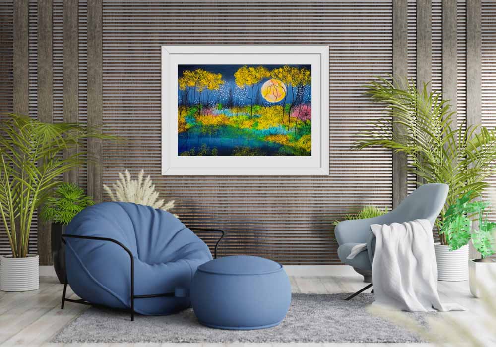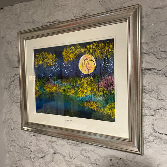 Unusually for Artist Nellie Hearn, this striking piece unfolds in shades of yellow, allowing the moon to glow with extraordinary brilliance. It rises slowly through golden‑tinted trees, illuminating a dark, mysterious sky. What an Enchanting artwork.