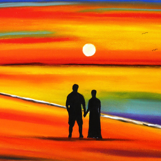 A couple in love stand on the soft, orange tinted sands of a quiet beach, the sky painted in brilliant hues of amber, orange and yellow as the sun dips gently towards the horizon. Both full of memories, laughter, long talks, and quiet moments.