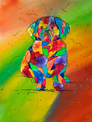“Rules Nah!” is a small, punchy burst of rebellion in dog form — an abstract, colourful creature with the compact confidence of someone who absolutely does not care what anyone thinks.