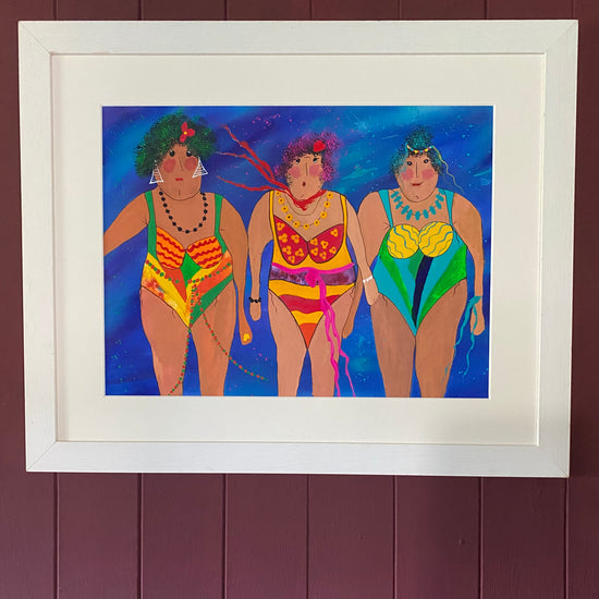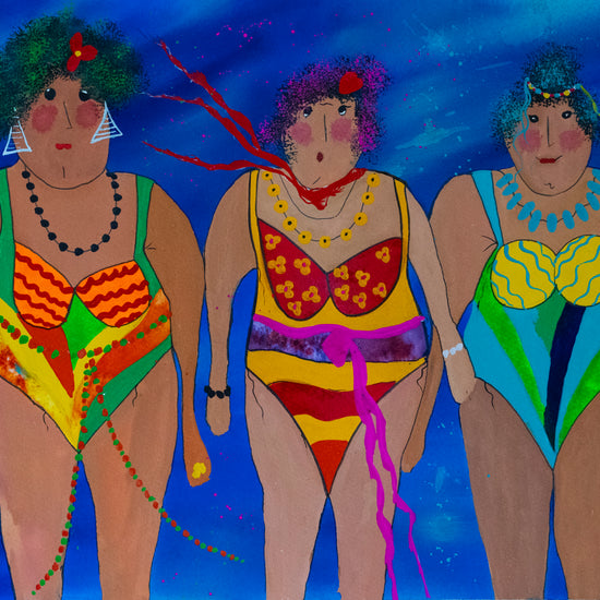 A playful, vibrant artwork of three cheerful ladies with exaggerated features, striking fun poses and radiating joyful energy.
