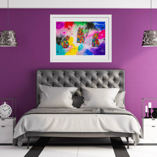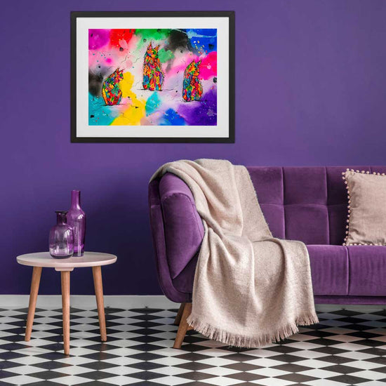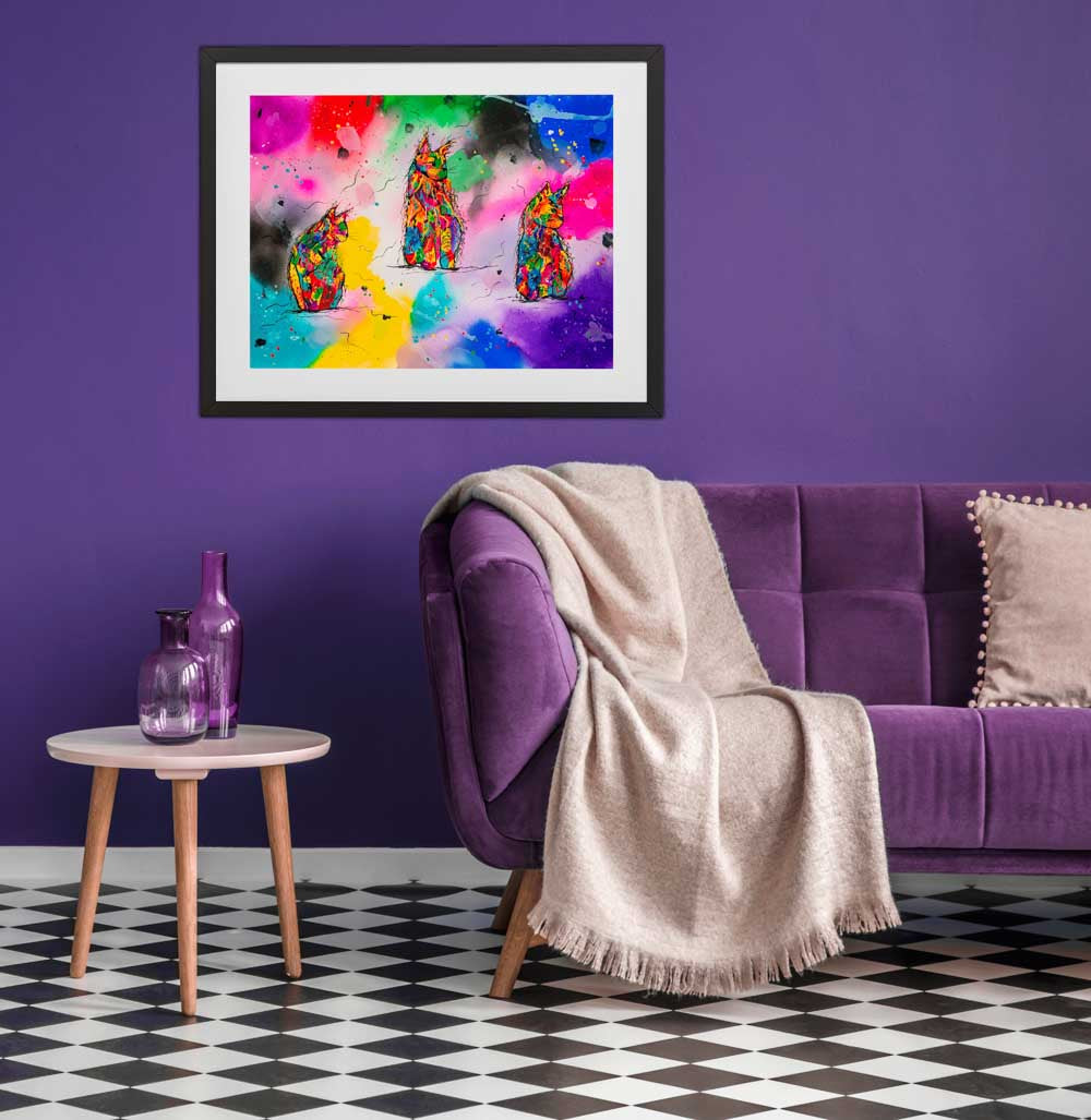 These three abstract cats appear across a blazing, neon-bright background. Loose, expressive lines and joyful chaos give them personality, as if they’re humming with colour, mischief, and warmth