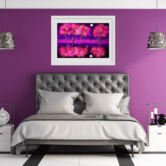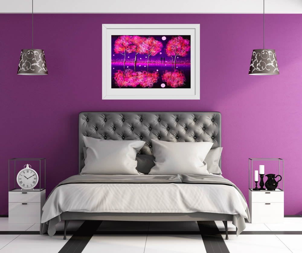 A loving couple alone together surrounded by gorgeous trees in shades of pink and purple